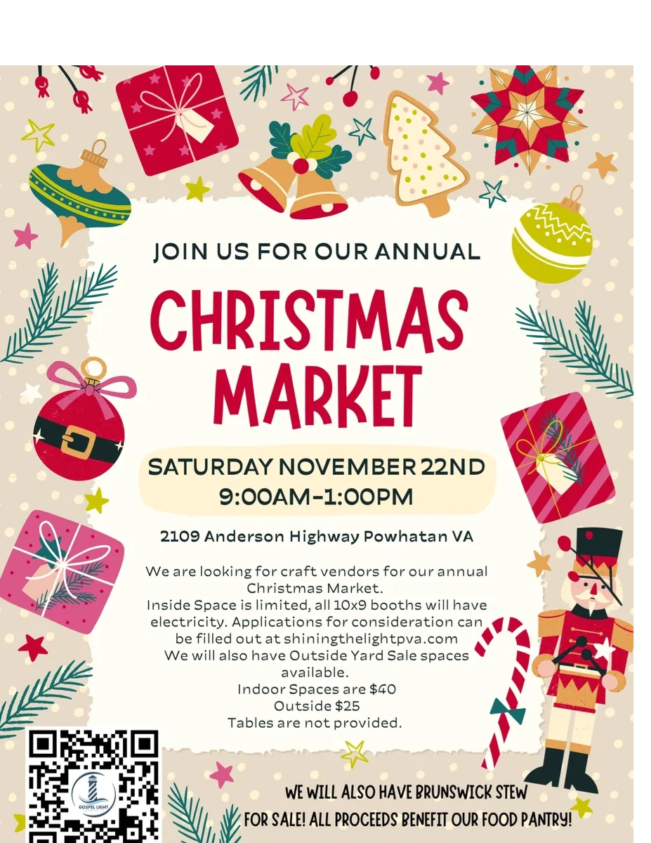 Event details are on the flyer. Please fill out the vendor form and pay the vendor fee. Both links below need to be followed. https://www.cognitoforms.com/GospelLightBaptistChurch1/ChristmasMarketVendorApplication On the Pay Vendor Link, choose "Craft Bazaar"